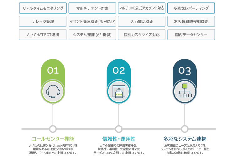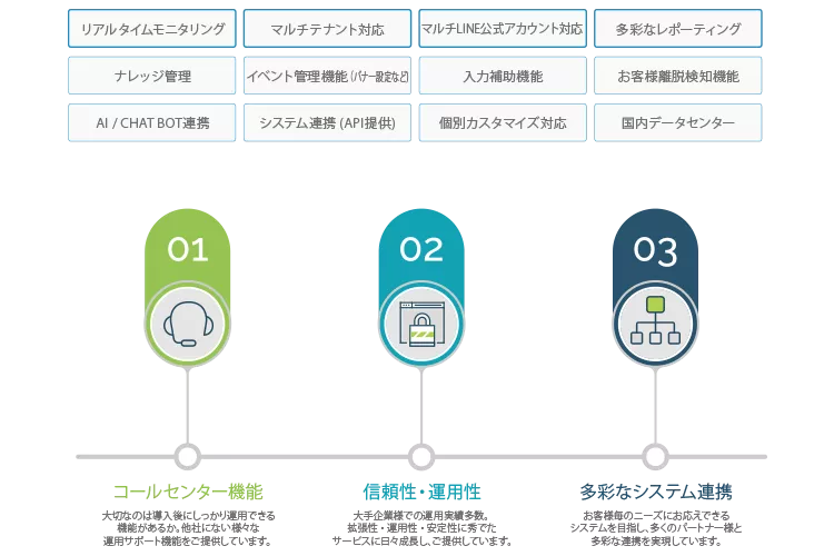 WEBサイト・LINE・自社アプリをインターフェースとした統合運用をはじめ、Chatbot連携、CRM連携などお客様によりコンタクトセンターの在り方、ご要望は様々です。