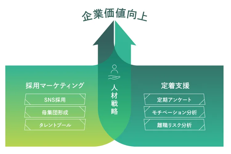 採用マーケティングと離職防止を一体化した仕組みにより、定着力の高い職場づくりを実現します。人が辞めない職場は採用にも強いという特性を活かし、定着の改善を通じて、自然と人が集まり続ける組織づくりを後押しします。