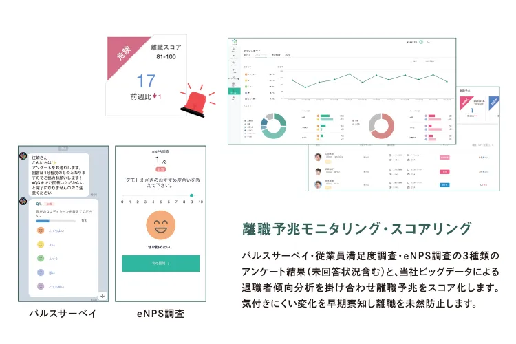 就業後の従業員に対し、パルスサーベイ・従業員満足度調査・eNPS調査の3種類のアンケートを定期的に実施。個人ごとの状態や離職に関する課題を継続的にモニタリングし、離職リスクをスコア化します。