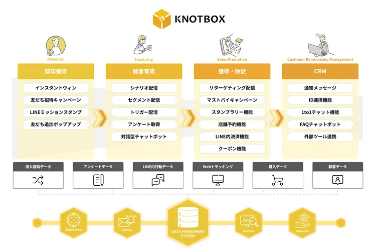 KNOTBOX(ノットボックス)は、LINE公式アカウントの可能性を最大限に引き出し、企業のマーケティング活動を統合的に支援するマーケティングソリューションです。