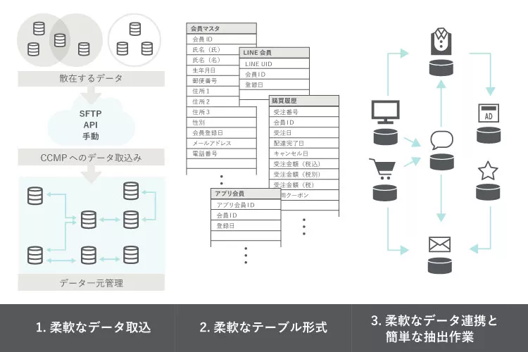 会員マスタ、購買履歴、行動履歴、キャンペーン送信履歴、キャンペーン反応履歴などの多種多様なデータテーブル間を共通キーにより柔軟に連携させることで、様々な条件によるデータ抽出が可能です。