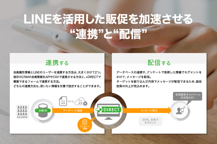 +DIRECTは、企業や店舗の「LINE公式アカウント」に登録される「友だち」のUIDや基本情報を即時同期しながら、更に高度なセグメント情報の取得、セグメント毎のコンテンツPUSH配信、既存顧客データベースとの連携、LINEに主軸を置いたCRMシステムの構築など、マーケティングで生じる様々な課題を解決できるサービスです。