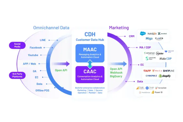 数あるLINE公式アカウント連携ツールの中で、MAACが持つ強みは、「データ連携とAI」にあります。