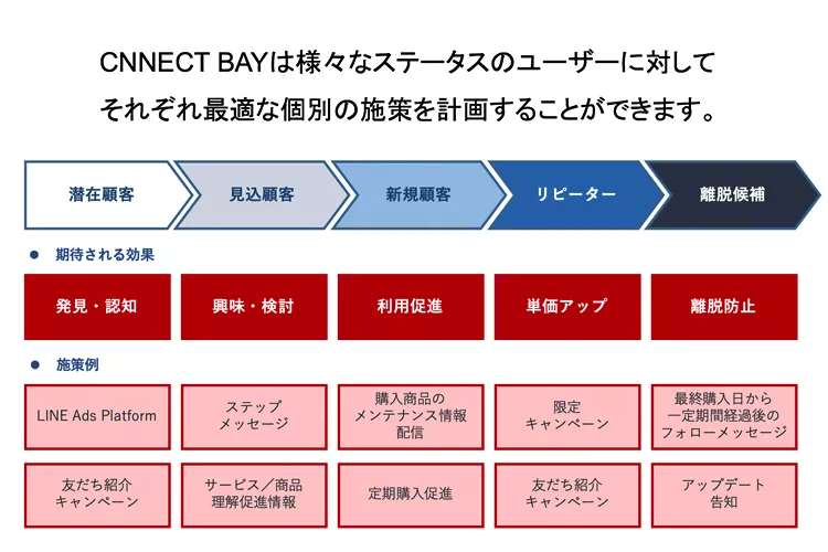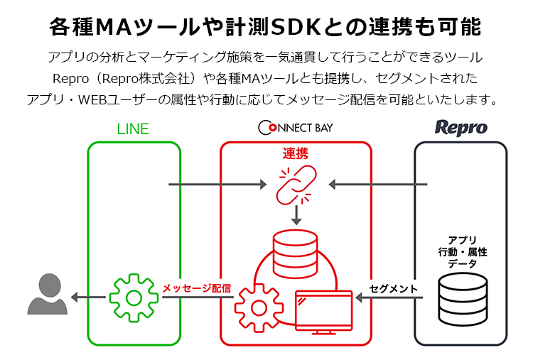 LINE及び様々なMAと連携可能なコネクトベイでは、ユーザーの行動に応じたセグメント配信が可能となり、エンドユーザーへ効果的なコミュニケーションが実現出来ます。
