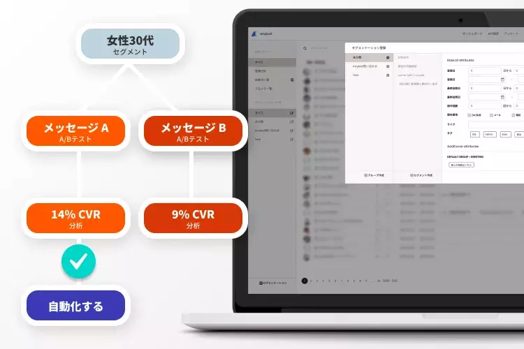 そのため、anybotのCRMは、御社が望む細かい属性セグメントで分けたペルソナグループを設定し、自動でユーザーをグループ分けしていきます。