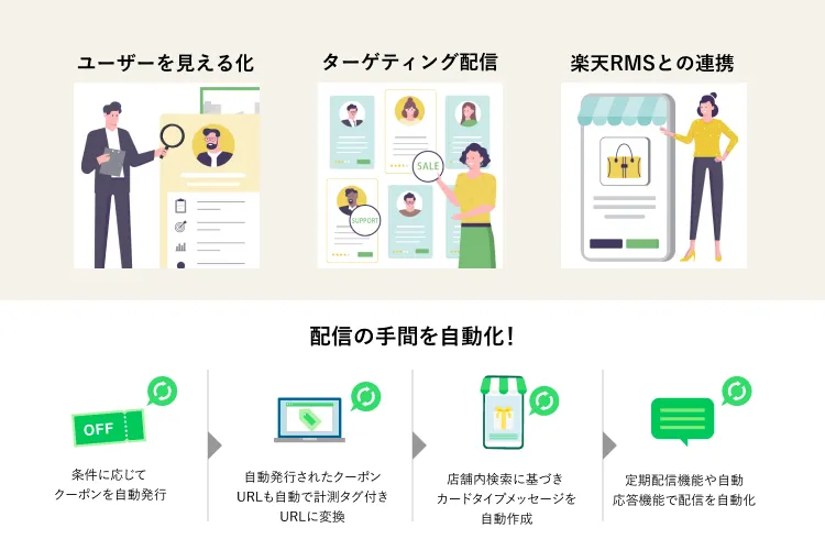 リッチメニュー・セグメント配信・ステップ配信——楽天に特化したLINE活用によるマーケティング施策を、かんたんに。