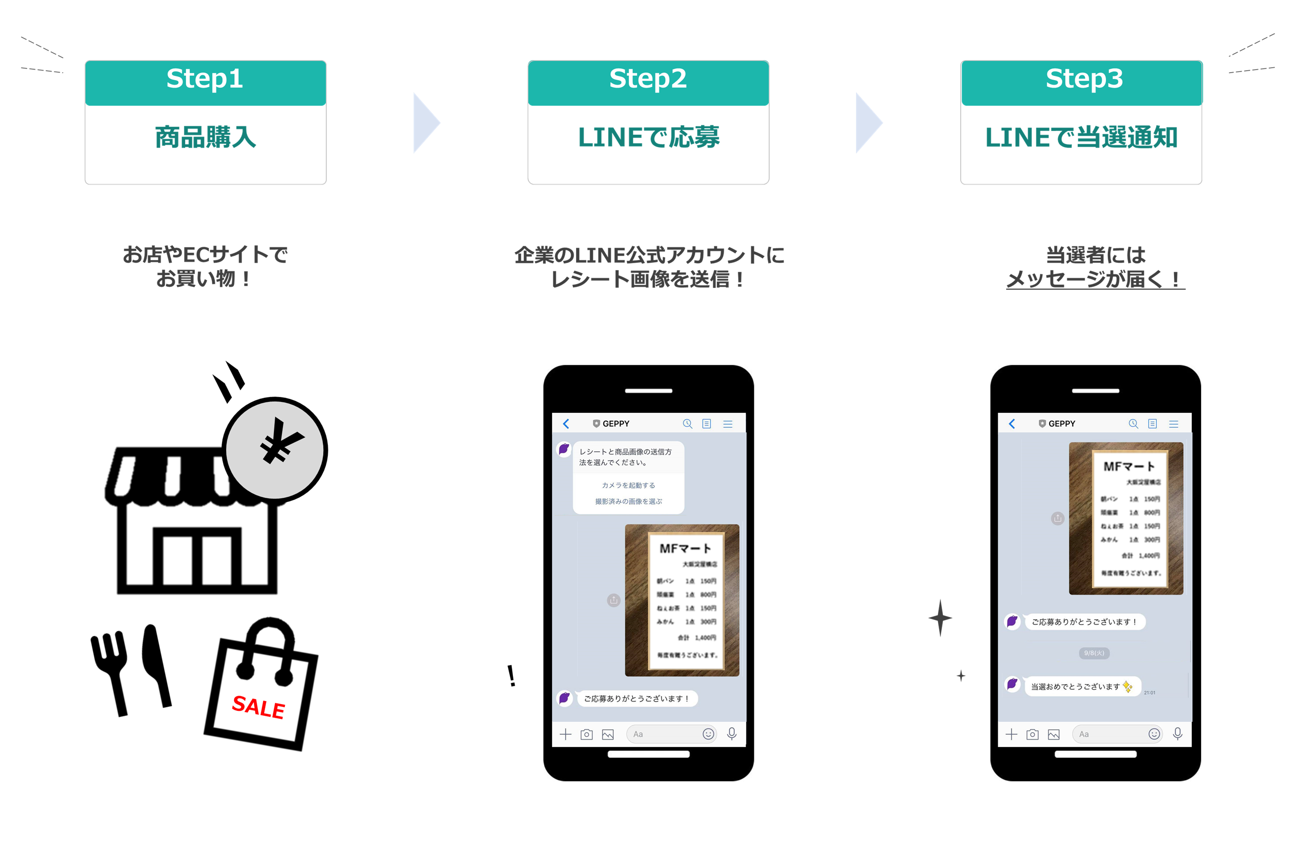 GEPPYはLINE公式アカウントを活用したキャンペーンシステムであり、トークルーム上でレシート応募型のキャンペーンが実装可能となります。 レシートチェック後のポイント付与を行う事でのマイル型、シリアルナンバーでの応募に紐づいたインスタントウィン型にも対応が可能であり、これまで様々な仕様のキャンペーンを成功に導いてまいりました。