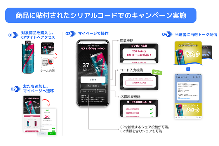 ペットボトル等の「商品に貼られたシール内のシリアルコード」の読み取り・入力を参加条件とした マストバイ型のキャンペーン が実施できます。