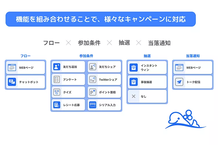 具体的には「フロー」×「参加条件」×「抽選」×「当落通知」の組み合わせで、以下のような御社オリジナルのキャンペーンを構築できます。