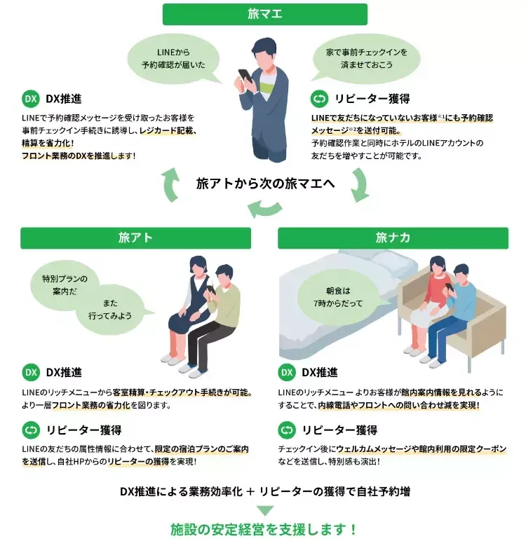 「D-Lipeat(ディーリピート)」は、ホテル管理システム(PMS)「Dynalution」の顧客情報を活用し、お客様のカスタマージャーニー(旅マエ・旅ナカ・旅アト)に合わせ、顧客コミュニケーションを最適化することで、フロント業務の効率化やリピーターの促進を通じて自社予約を強化するソリューションです。