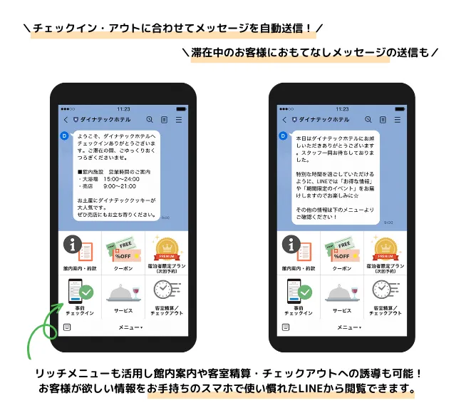 チェックイン・アウトと連動し、メッセージを自動送信し、滞在中の館内案内や、LINEの友だち限定のクーポンのご案内など、非接触でも可能なおもてなしのご提供ができ、館内施設の利用促進も可能です。