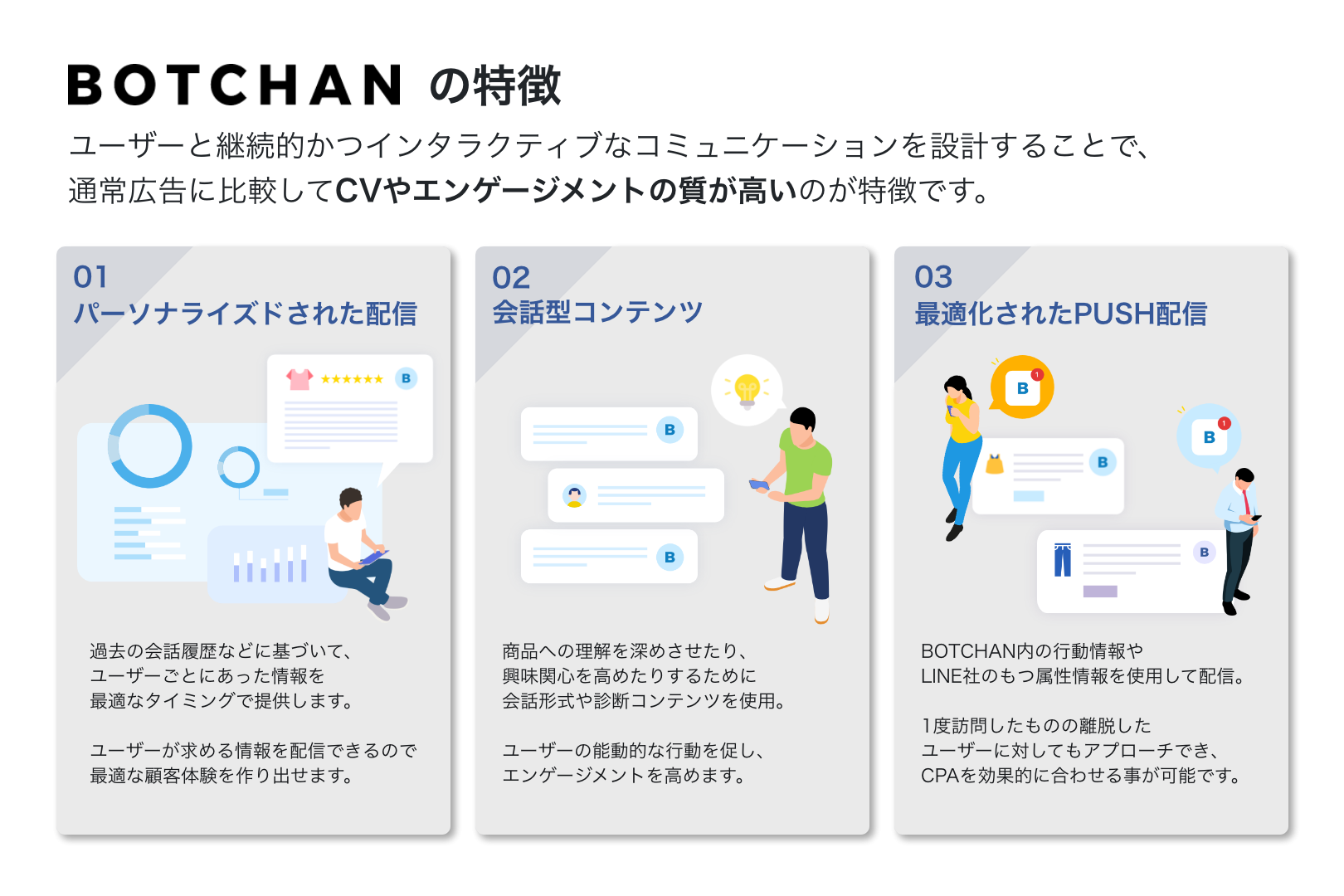 マーケティング支援型のオンライン接客プラットフォームBOTCHANは、CV獲得に特化したチャットボットサービスで、スマホ時代のおもてなしを実現します。