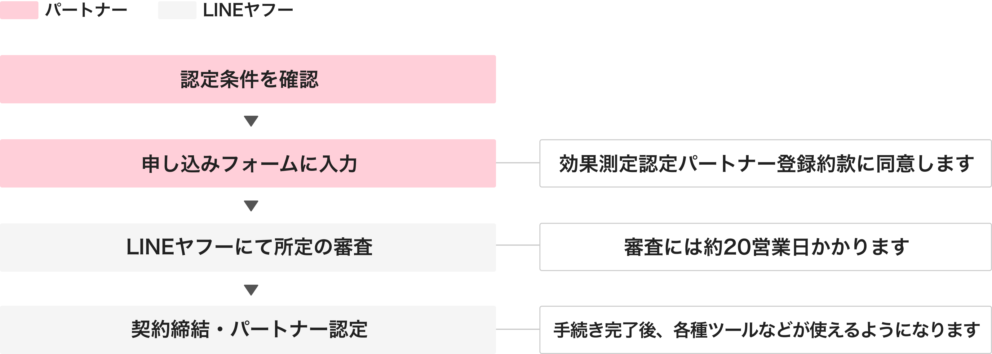 具体的には、「効果測定認定パートナー登録約款」に同意し、かつLINEヤフーが定める日本と同等の個人情報の保護が期待できる国または地域の法人であること。