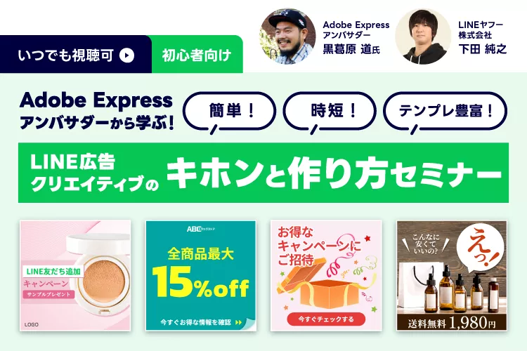 ※ 本セミナーは「LINE Creative Lab」と「Adobe Express」を使用して作成のデモンストレーションを行います。事前にLINE広告のアカウント開設〜LINE Creative Labにログイン、アドビアカウントのご登録をいただくとスムーズです。詳しい ログイン/登録方法 はページ下部をご確認ください。