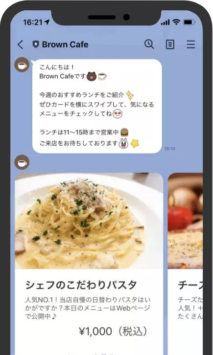 「LINE」のトーク画⾯から、店舗や企業のアカウントの友だちになったユーザーに対して、メッセージを届けることができます。国内MAU9,900万人※の「圧倒的なリーチ⼒」と、コミュニケーションアプリの特徴を活かした「One to Oneコミュニケーション」により、効率良くユーザーとの深いつながりを実現することが可能です。※ 2025年6月末時点時点