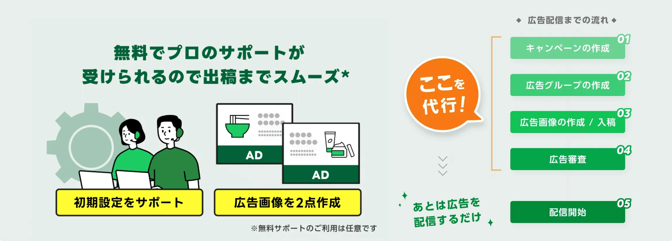 はじめての方でも安心!広告の出稿までに必要な設定と広告画像の作成を専門のスタッフが代行する