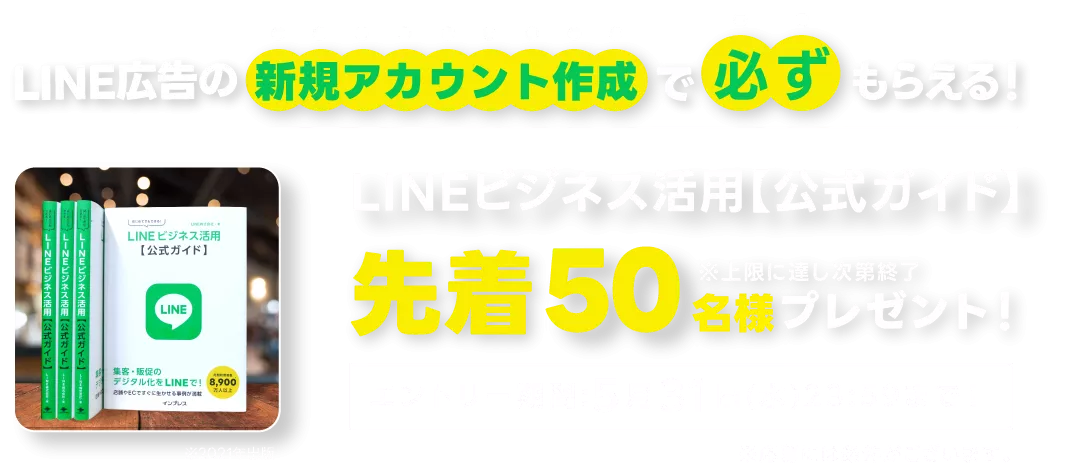 - 書籍(「はじめてでもできる! LINEビジネス活用【公式ガイド】」)の転売、オークションサイト等での出品・販売は固くお断りします。これらを目的とした応募は、直接の応募又は第三者を通じた応募を問わず、お断りします。