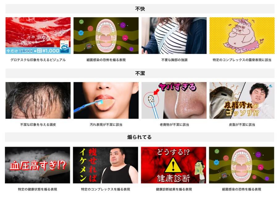 - テキスト・画像・動画・ランディングページの関連性が認められない