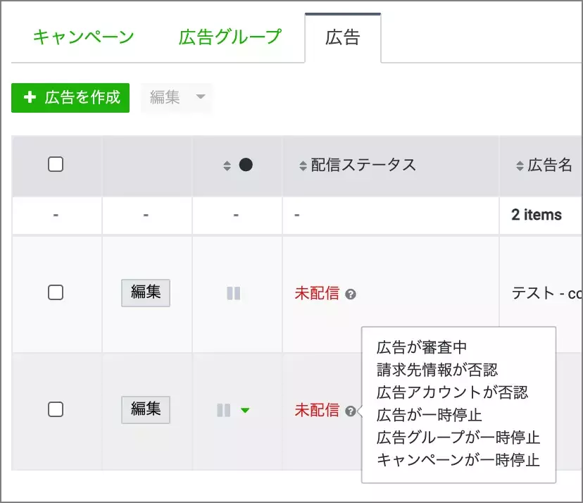 なお、配信中の広告がある場合、広告の配信が停止します。
