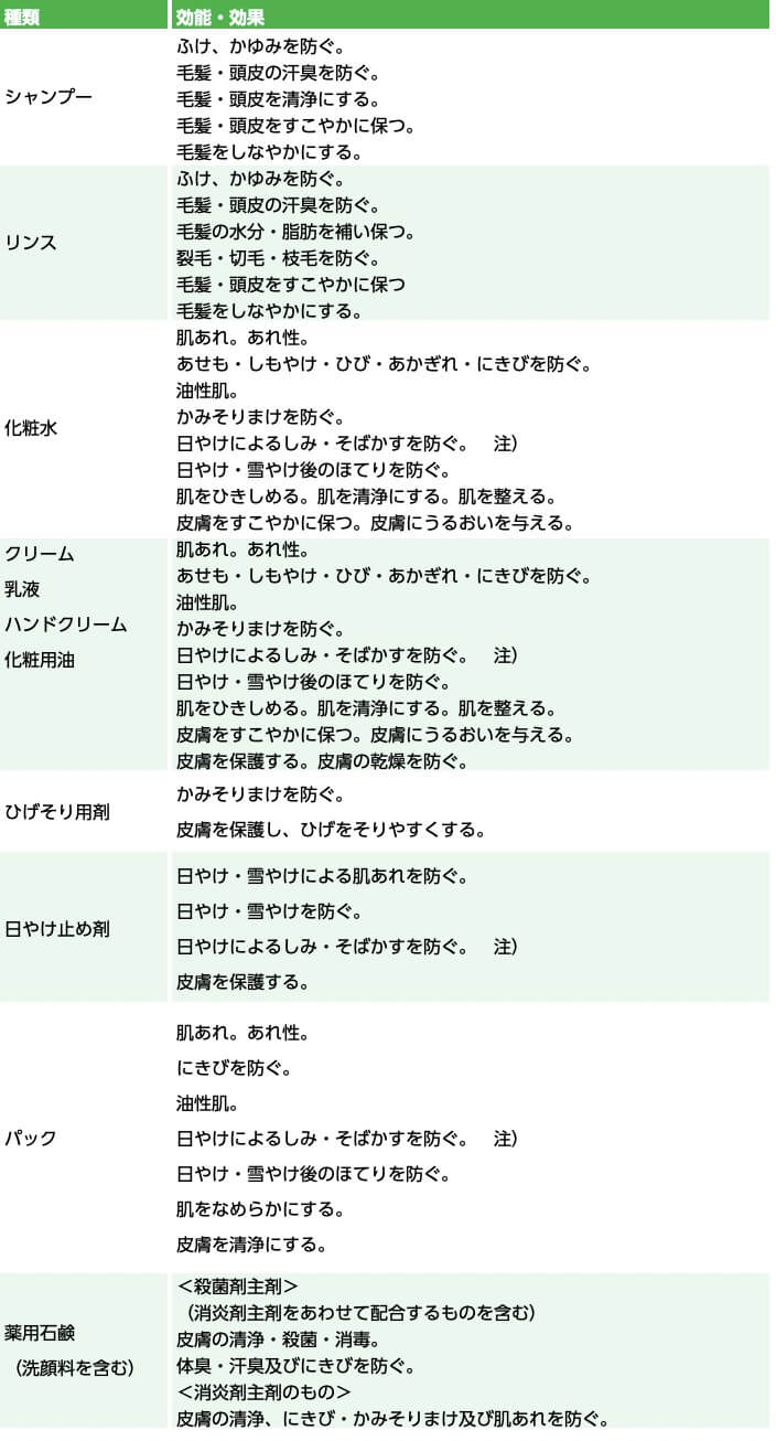 例:「化粧くずれを防ぐ」、「小じわを目立たなく見せる」、「みずみずしい肌に見せる」、「傷んだ髪をコートする」、「清涼感を与える」、「爽快にする」等