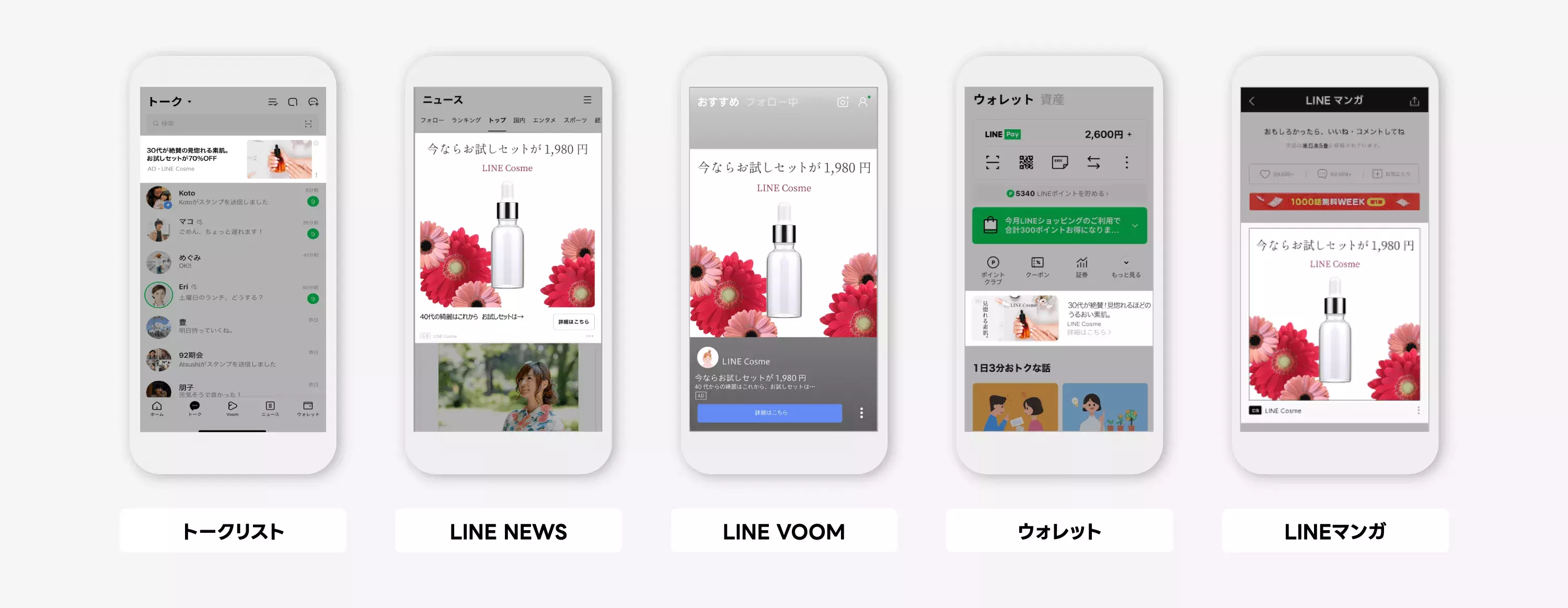 「トークリスト」や「LINE NEWS」、「LINE VOOM」をはじめとするLINEの様々な面やファミリーサービスなどに広告配信が可能。