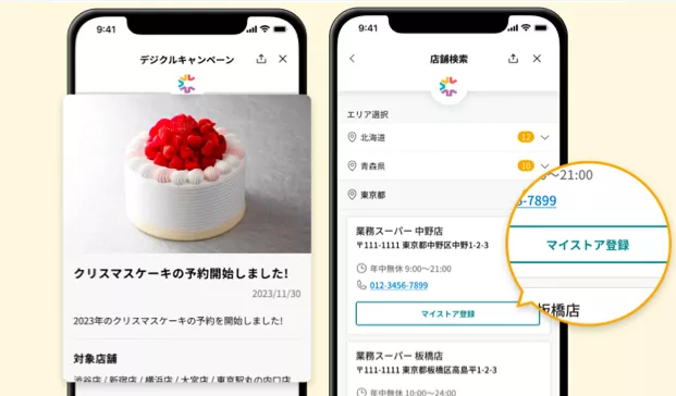 お店のお得情報等の発信ができる「お知らせ」機能や、よく利用するお店を登録いただける「マイ店舗」機能も無料で搭載。普段ご利用中のデジタルチラシサービスへの導線を作ることが可能です。