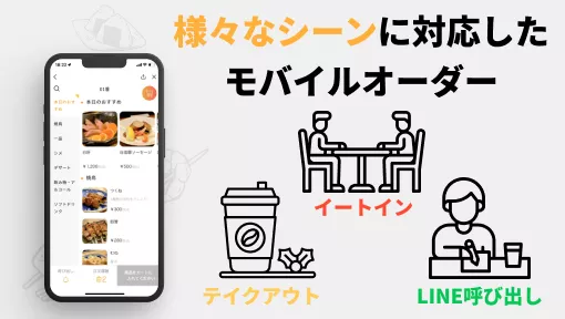 イートインのモバイルオーダー対応はもちろん、LINE呼び出し機能でフードコートのような受け渡し式の店舗にも対応し、さらには予約テイクアウト機能で、店外からの注文にも対応可能です。