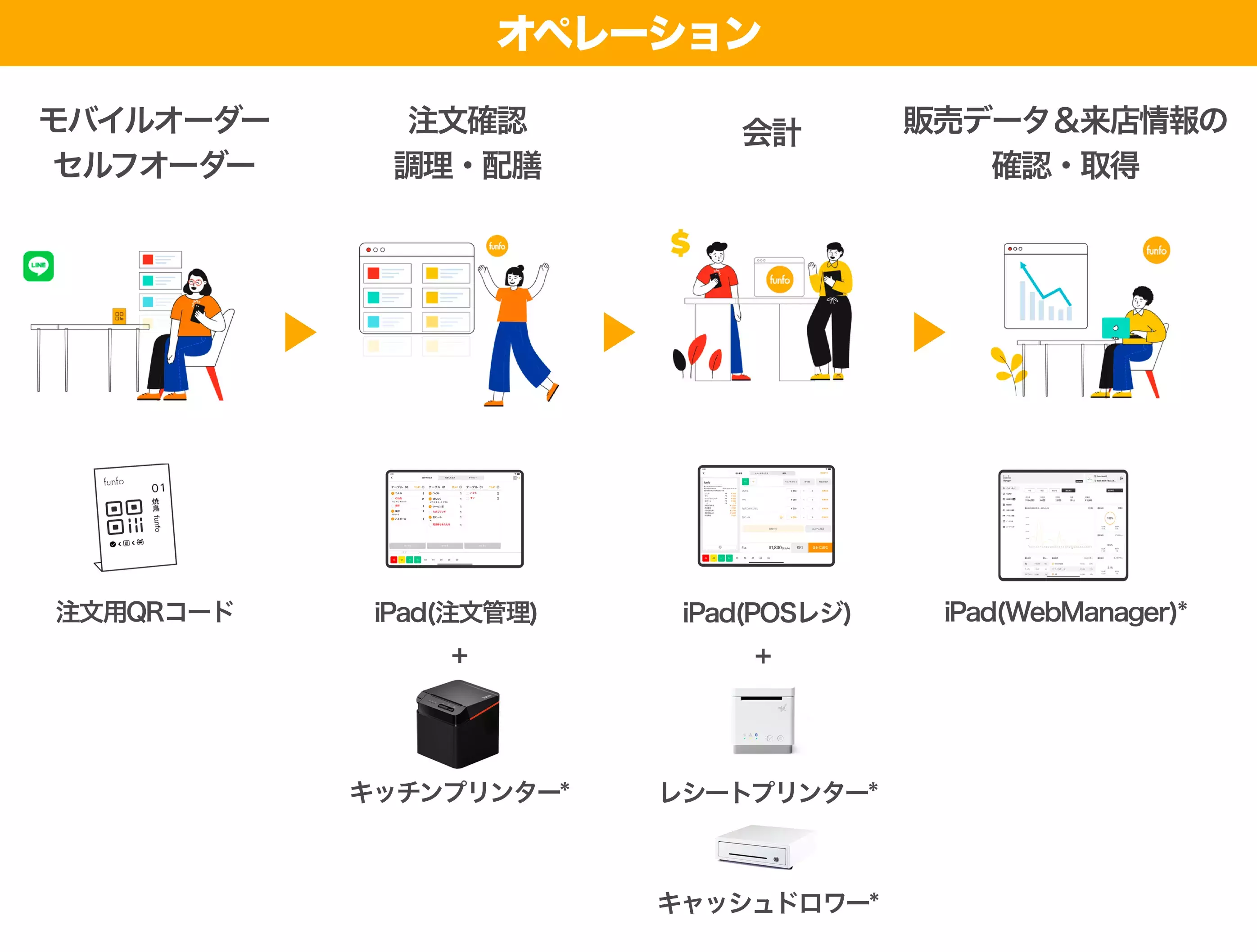 外部連携導入機材:お店側/店舗用アプリ(iPad)、キッチンプリンター、レシートプリンター、キャッシュドロア、カード立て