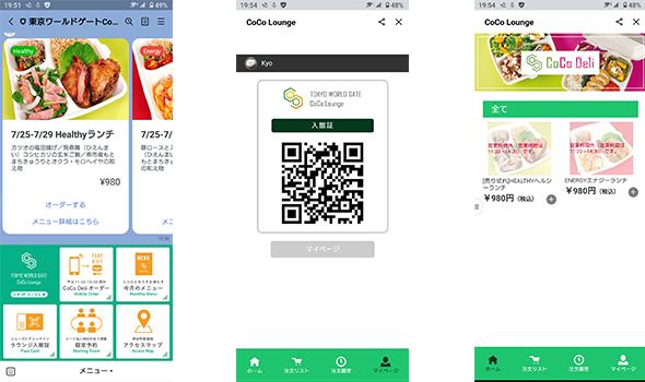 ラウンジの入館チェック、非接触でランチボックス販売を行いたいという要望に応え、入館時の会員証表示と、読み取りのタブレット用アプリを別途開発。入館チェックするとテイクアウトアプリが利用可能となります。