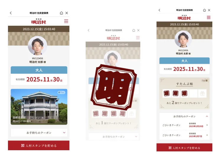 カードタイプで運用していた住民登録票(年間パスポート)をLINEミニアプリ上でのデジタル化により、遠隔での発行と決済が可能となりスムーズな入村を実現しました。また入村回数に応じた「入村すたんぷ」の取得数により駐車場無料などの特典が受けられる「ごひいきクーポン」を発行するなど、住民のLTV向上も図っております。