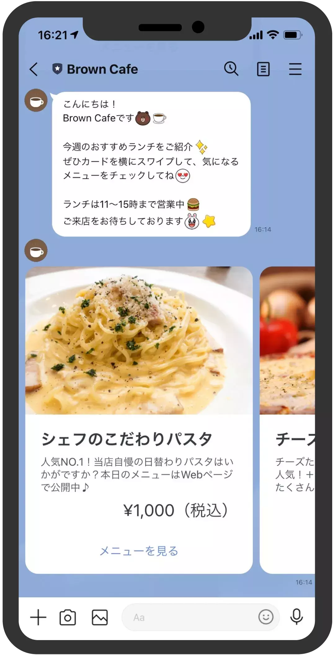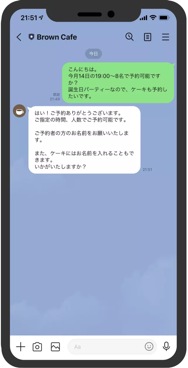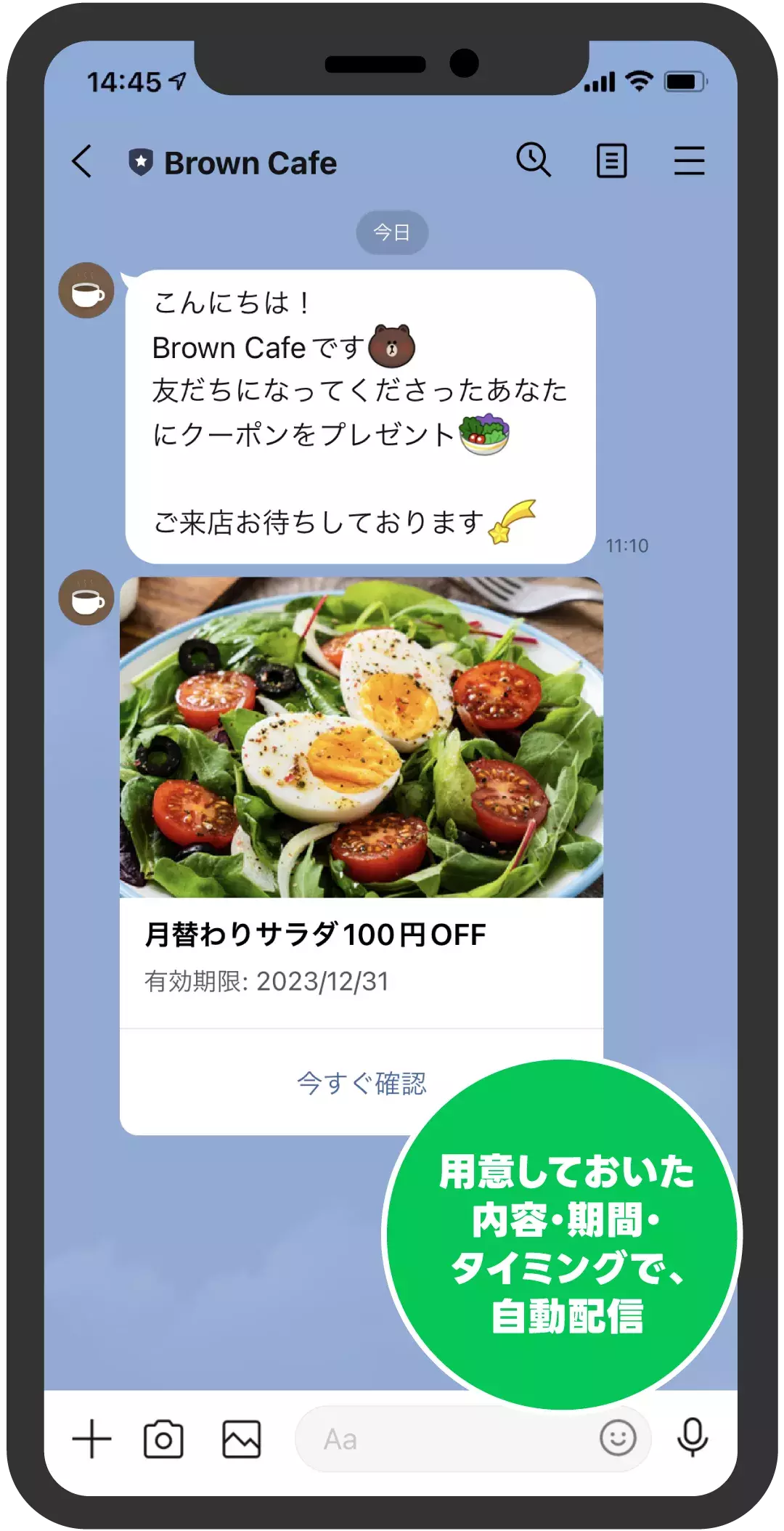 LINE公式アカウントを開設している企業や店舗が、日常的に使っているLINEアプリのトーク機能 を通じて、友だちになっているユーザー一人ひとりとコミュニケーションが取れる機能です。