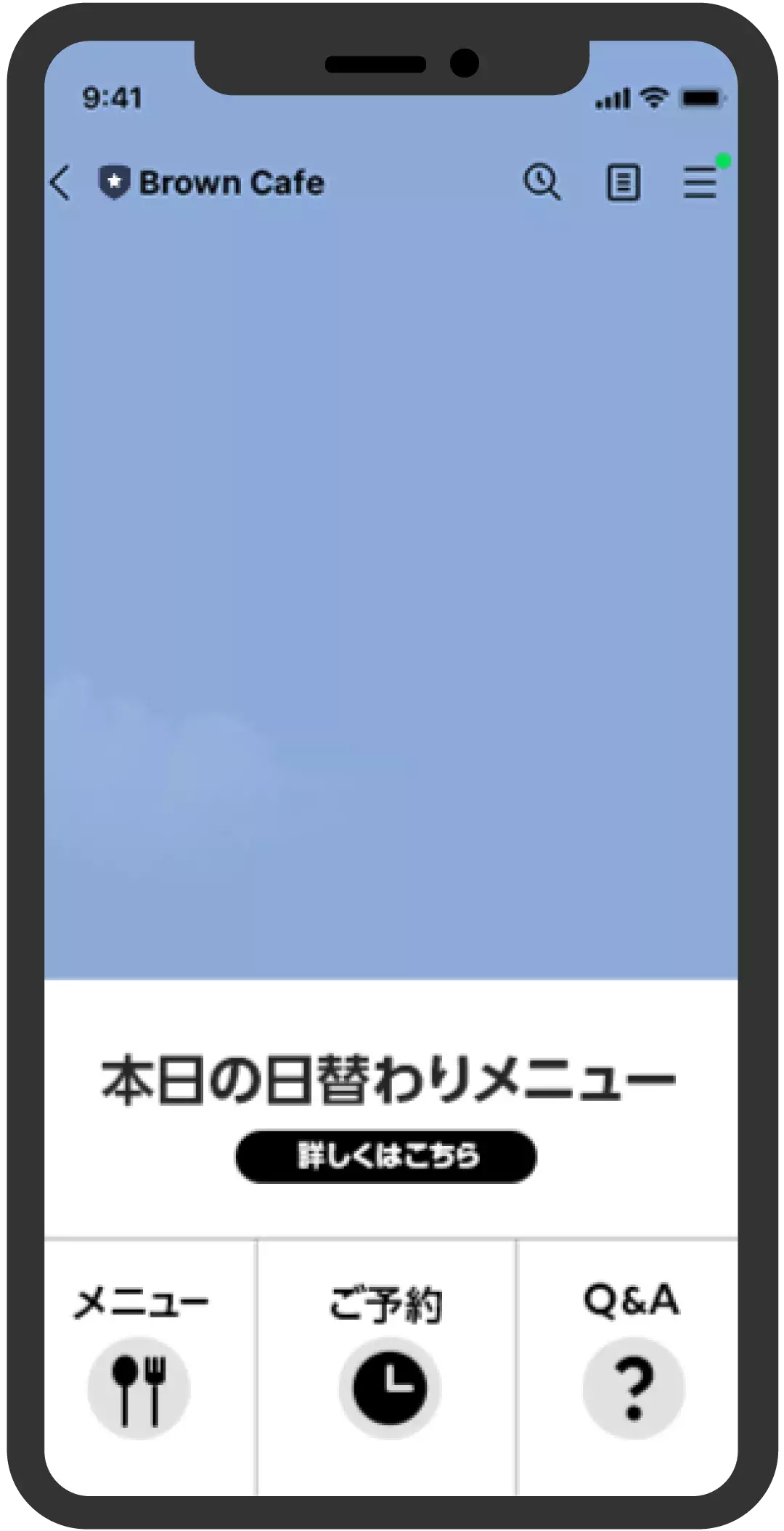 トーク画面下部に固定で表示されるメニュー機能です。クーポンやショップカードなどのLINE公式アカウントの機能のほか、ECサイトや予約サイトなど、外部サイトへのリンクを設定できます。