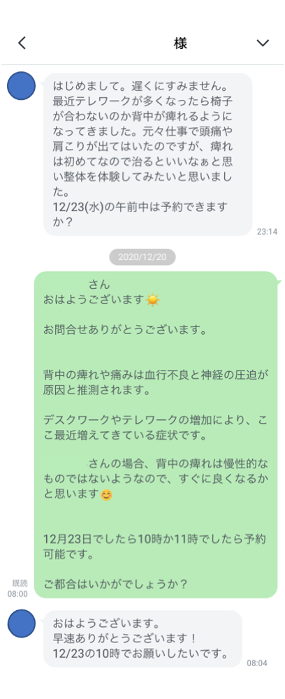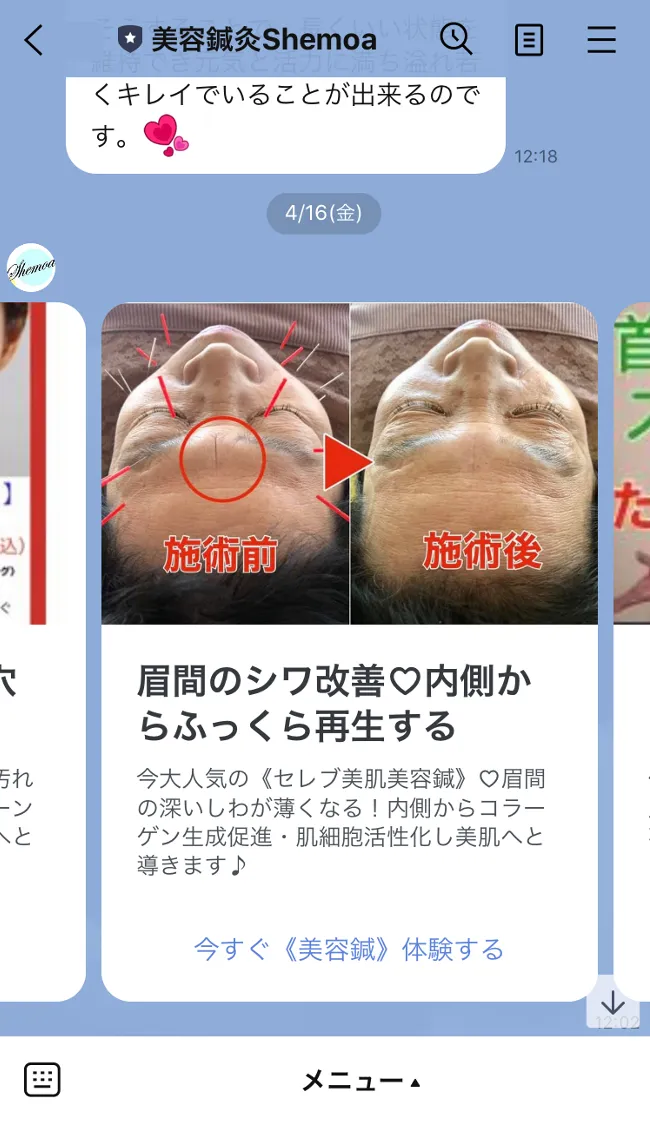 LINE公式アカウントは電話より気軽に利用できるため、現在、問い合わせの8割がLINE経由です。LINEチャットではお客さまのお悩みに必ず一言アドバイスして、安心して来店いただけるよう心がけています。そうしたコミュニケーションが功を奏し、こちらから次回予約をお勧めしなくても2〜3週間ごとに来店されるお客さまが多くおられます。
