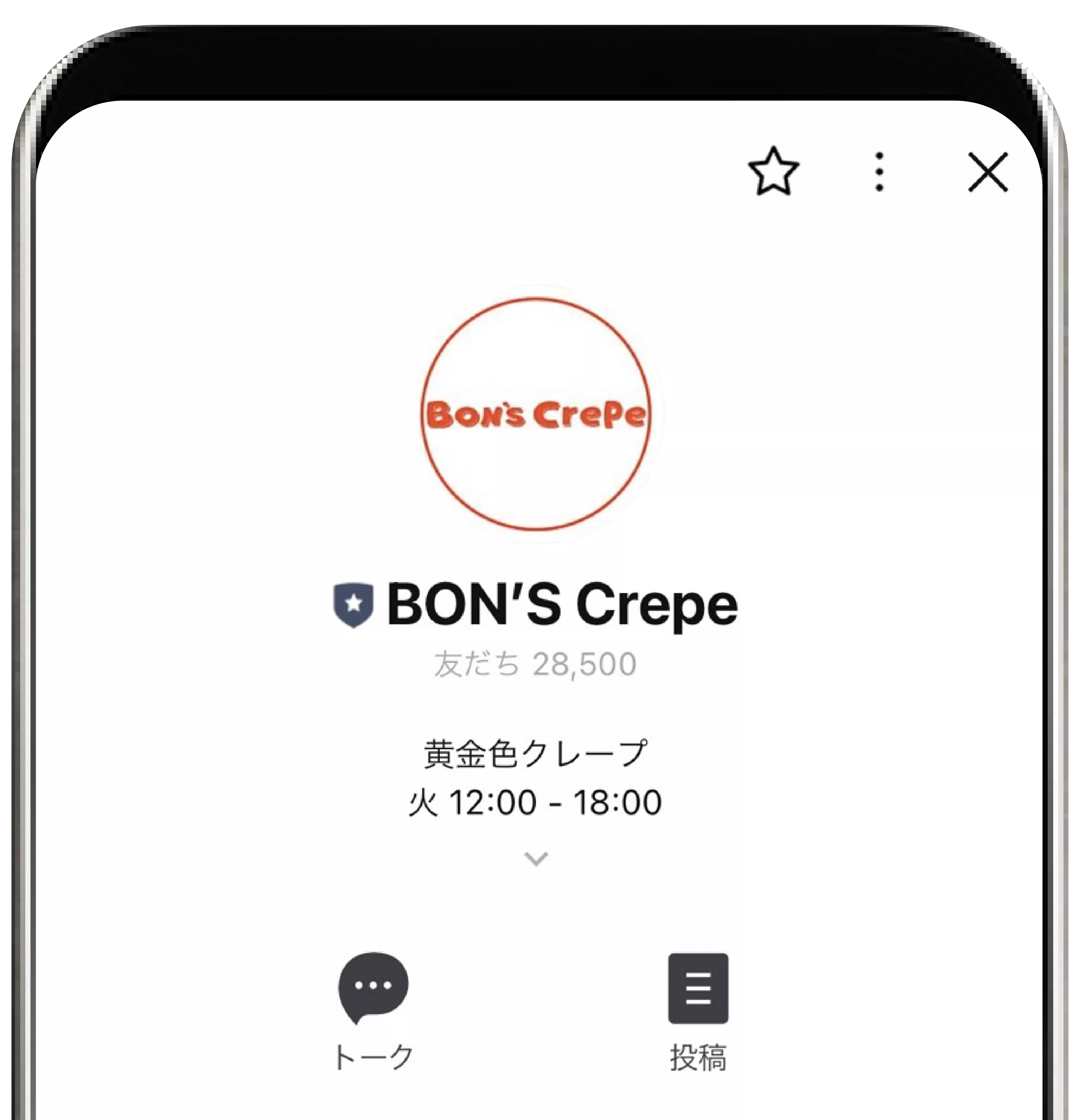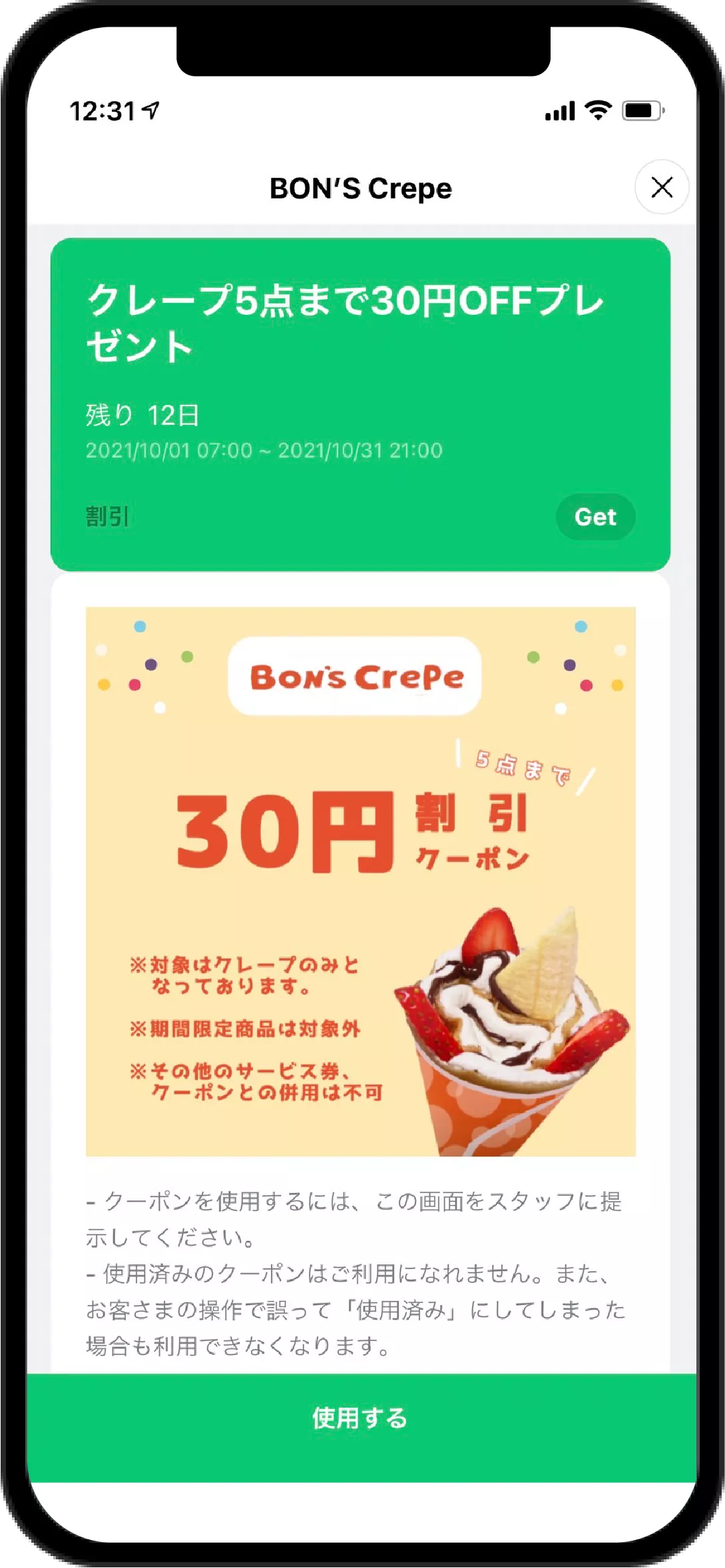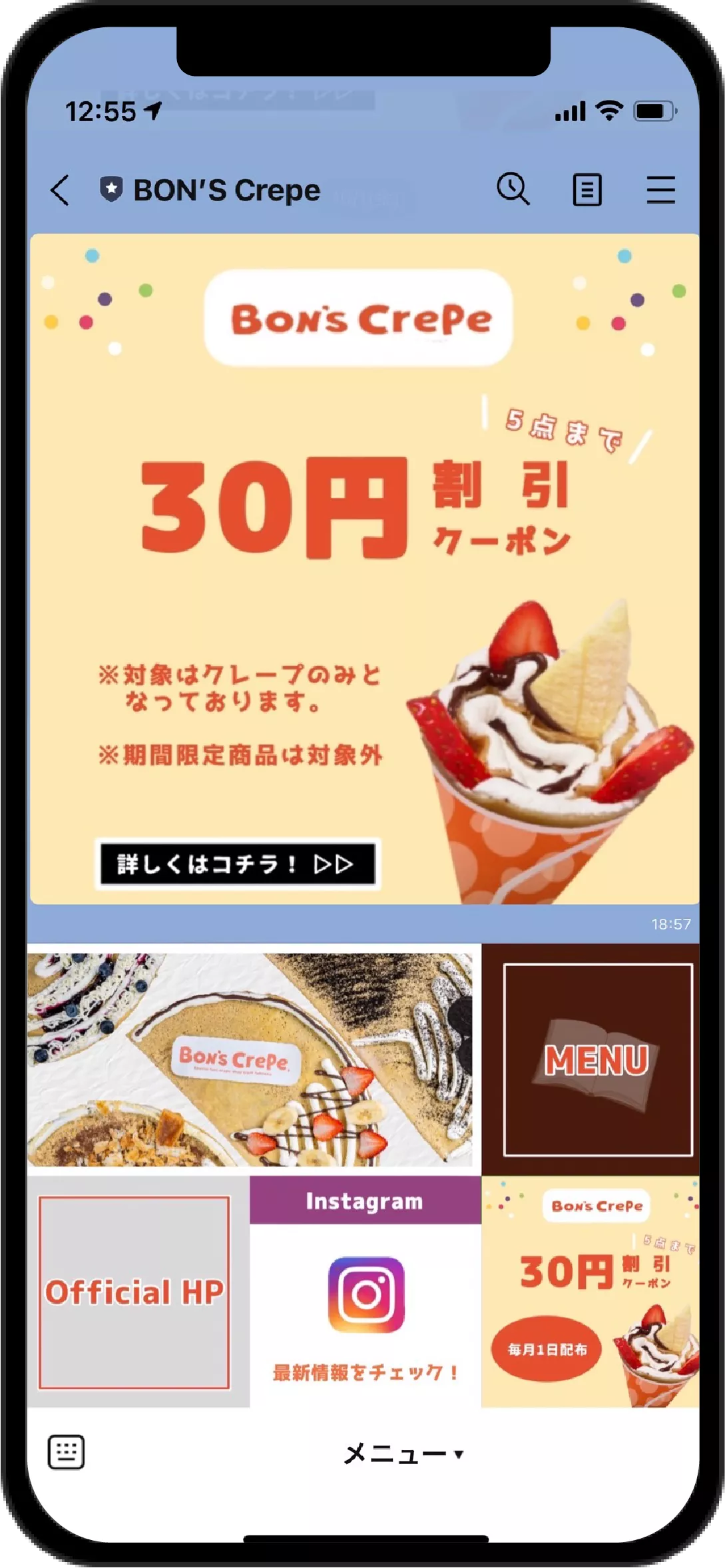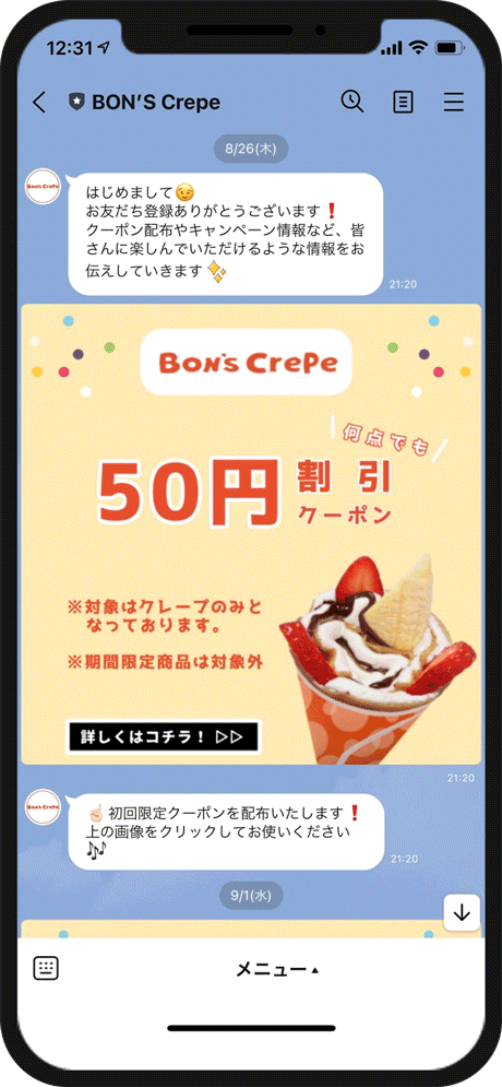 - 友だち追加の特典として、クレープの50円割引クーポンを配布