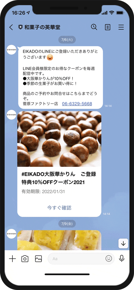 - 毎週月曜日と金曜日の朝9時に配信。毎週月曜日はEIKADOの名物「華かりん」の10%オフクーポン、毎週金曜日は季節の商品や新商品のクーポンを配布