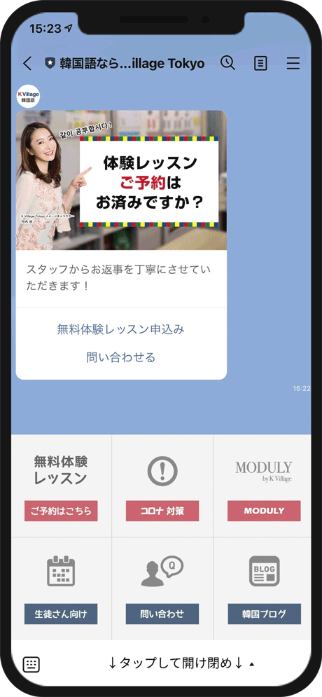 LINEのトーク画面下部に固定で表示されるメニュー機能です。画面を大きく占有するためユーザーの注意を引きやすく、クリエイティブとともにリンクを設定することで、LINE公式アカウントの各機能のほか、外部サイトや予約ページなどにユーザーを誘導することができます。