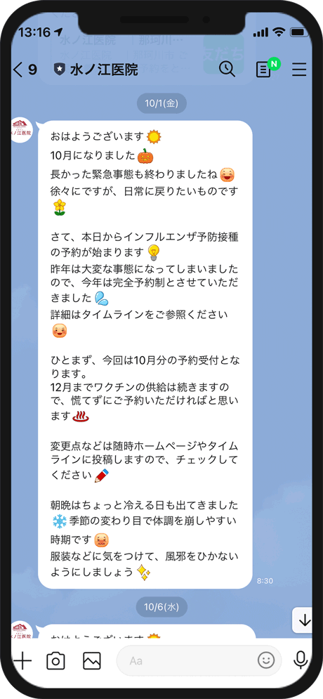 - テキストメッセージを中心に、一斉配信で予防接種の受付開始や営業時間についての案内を記載