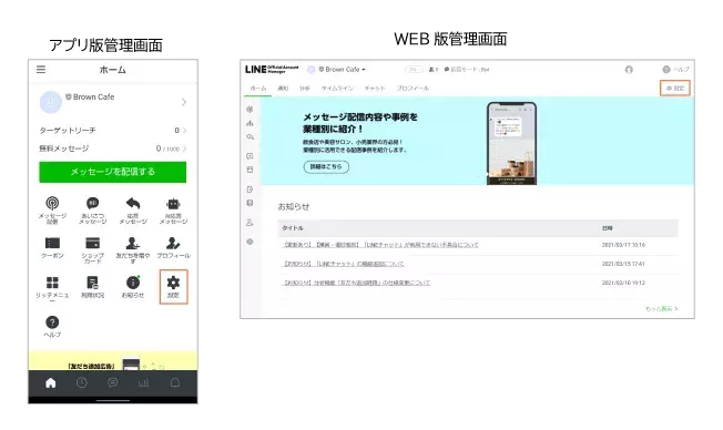 ① LINE Official Account Manager(LINE公式アカウント管理画面)にアクセスし、右上の「設定」(アプリ版はメニュー内の設定をタップ)ボタンをクリック