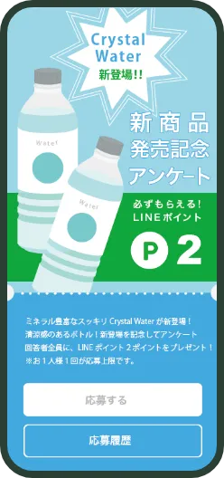 (アンケート型)LINE上でアンケートに答えると簡単にキャンペーン応募ができ、応募者全員にLINEポイントが進呈されるキャンペーンプラットフォームです。
