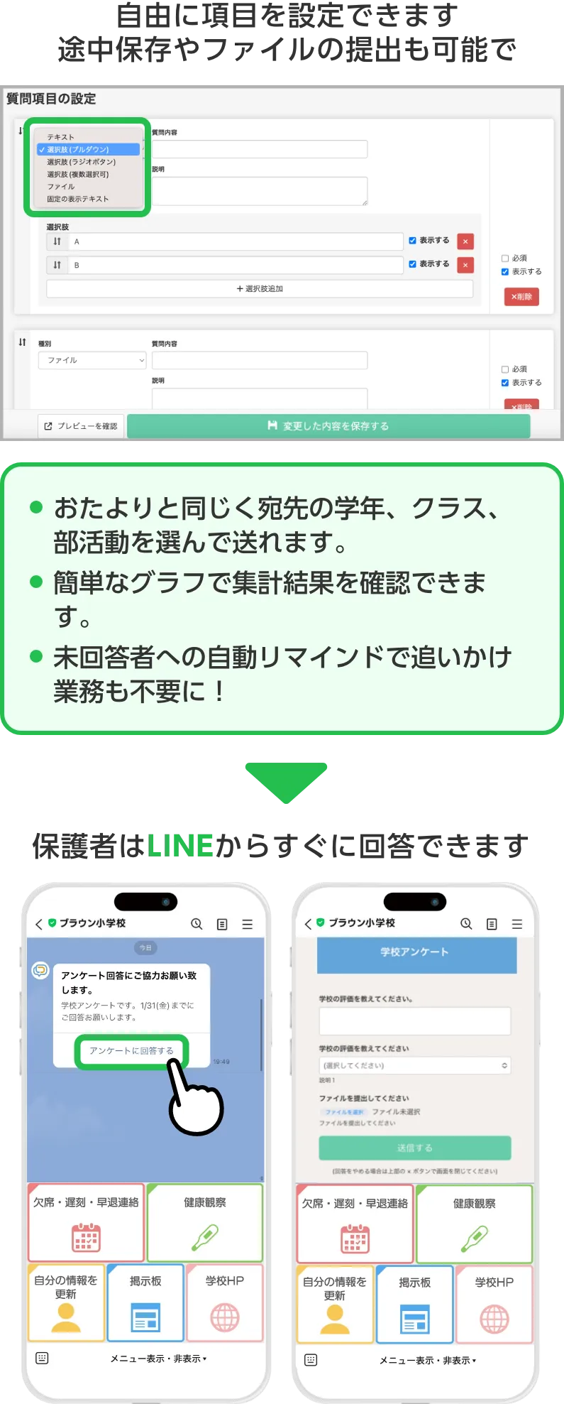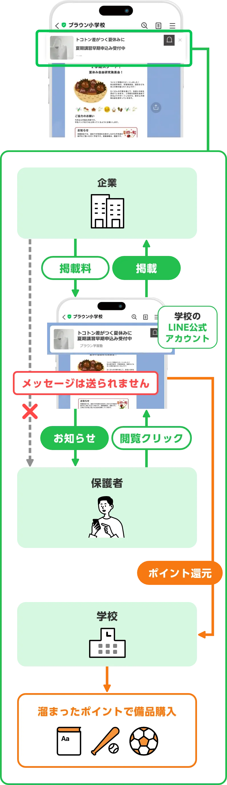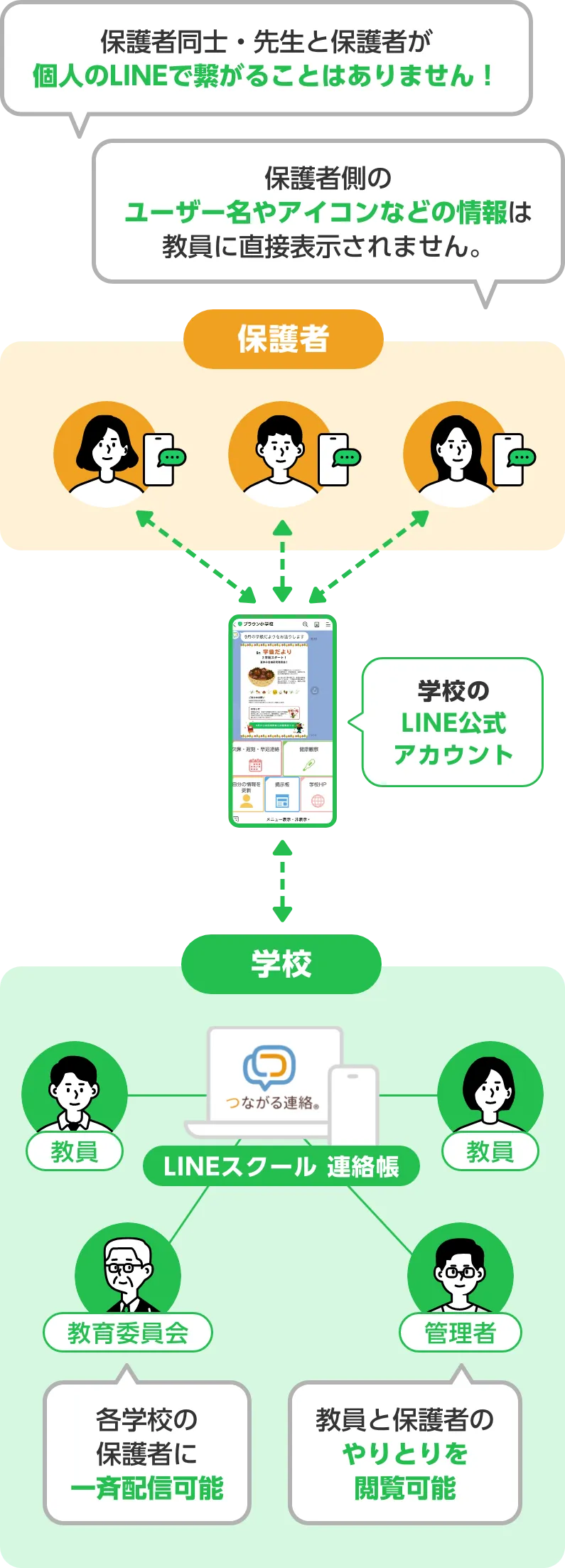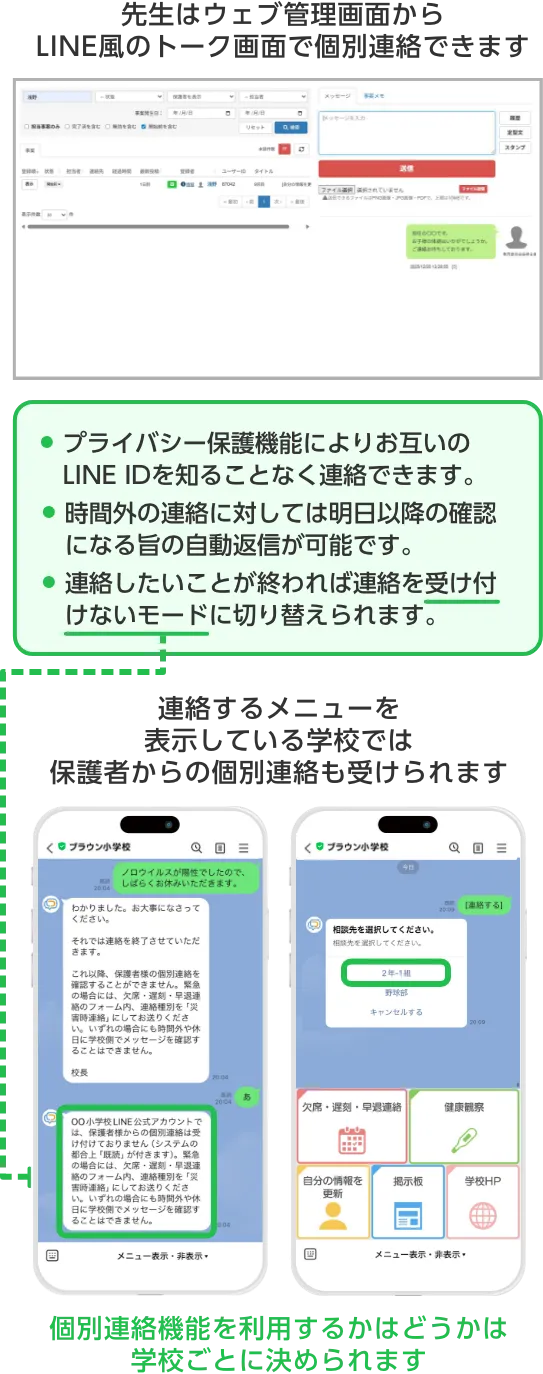 教職員は専用の管理画面を教員PC/モバイル端末から操作。LINE公式アカウントで保護者のLINEと繋がります。