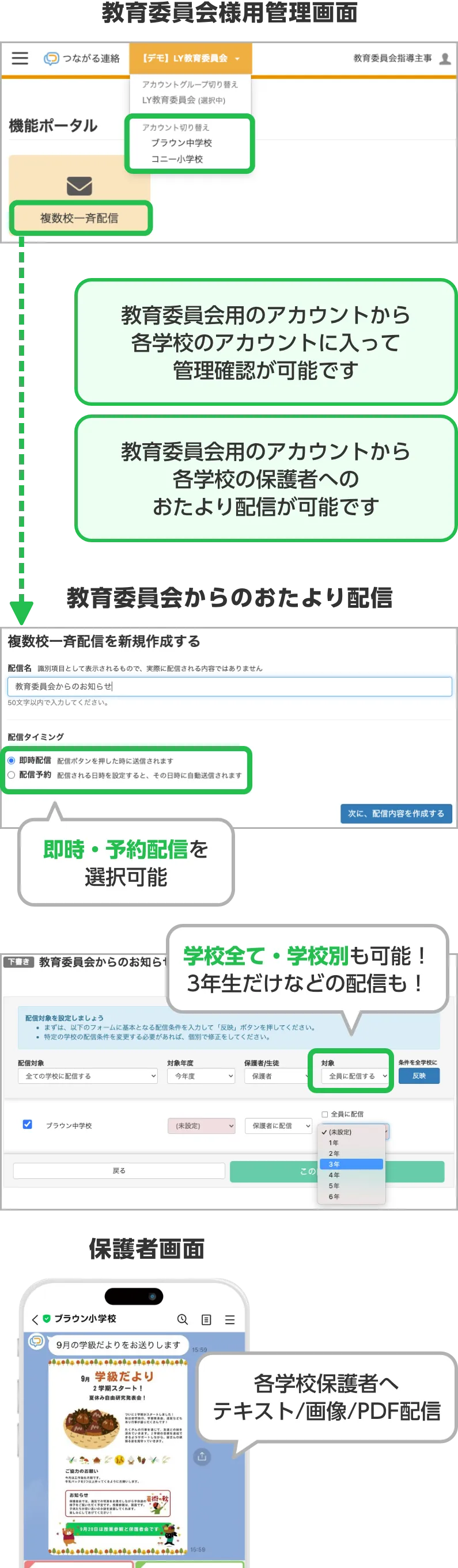 教育委員会側で各学校のアカウントを管理できます。また、教育委員会から各学校の保護者に直接、お知らせを配信することができ、重要な通知を確実に届けることができます。