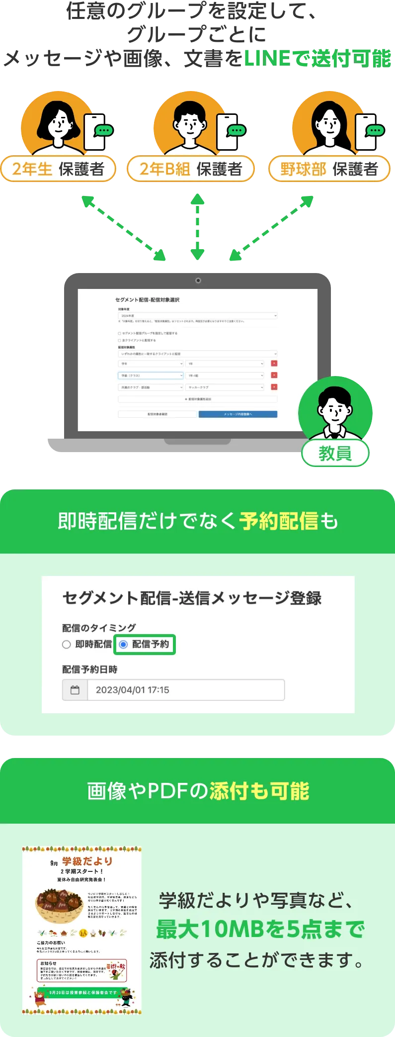 PDFや画像の送付が可能で、既読確認や同意確認機能付。クラスや学年、部活動など必要な保護者グループだけに情報が配信できます。