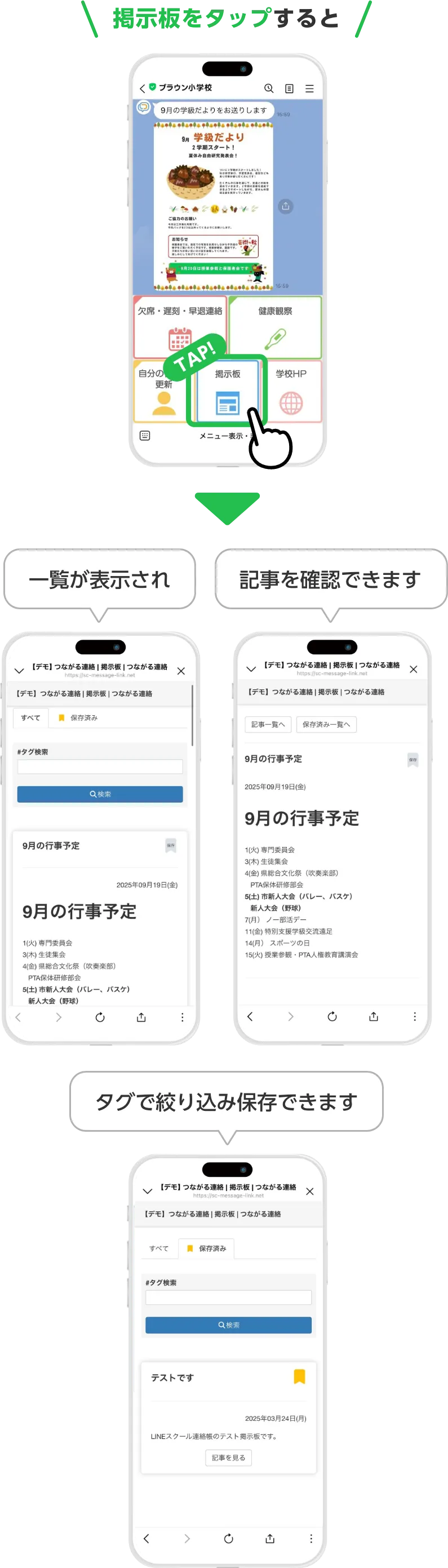 掲示板機能でいつでも見返しやすいお知らせの掲載も可能です。重要な情報は保存・管理し、必要な時に簡単に検索・閲覧できます。