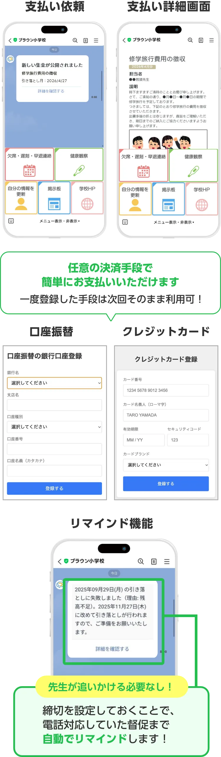 給食費や学年費、PTA会費など定期的な支払いから、写真販売、部活動費などの都度支払いまで、LINEを経由して集金することができます。リマインド機能もあるため、教職員が保護者に催促する負担を軽減できます。