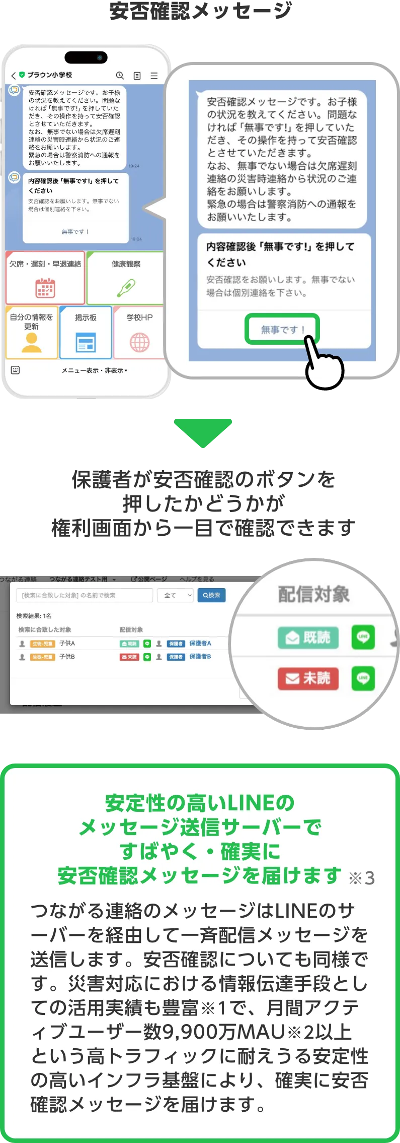 1億人の利用者数を誇るLINEを活用するため、保護者へのアプリ導入促進や説明が不要。