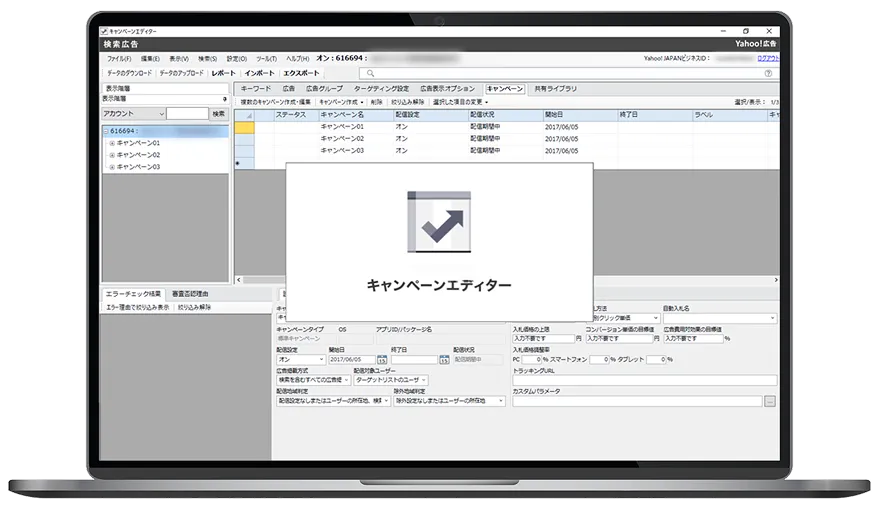 ※キャンペーンエディターは、検索広告の広告主様がご利用可能なツールです。弊社の広告掲載基準および、広告取扱基本規定に抵触された場合、キャンペーンエディターをご利用になれない場合がございます。あらかじめご了承ください。