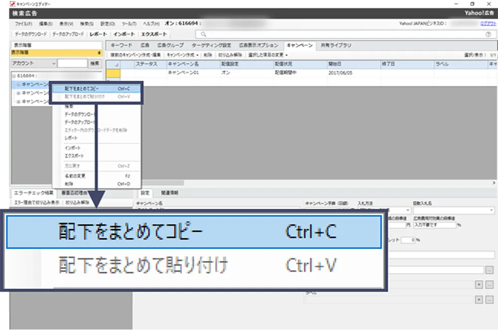 キャンペーンエディターは、データの大量入稿や一括編集を行い、効率的なアカウント運用を支援するアプリケーションです。広告管理ツールとは異なり、CSV形式のインポート用テンプレートをそのまま入稿できます。また、キャンペーン配下をまるごとコピー&ペーストできるため、短時間で複数のパターンのキーワードや広告を作成、編集できます。
