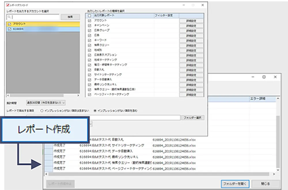 キャンペーンエディターでは、広告管理ツールでは出力できない項目「広告グループの入札価格」「最大CPM」「対象外キーワード」「入札価格」「配信設定」「審査状況」を含めたレポートが作成できます。また、複数のアカウントをまたいだレポートをまとめて作成できます。
