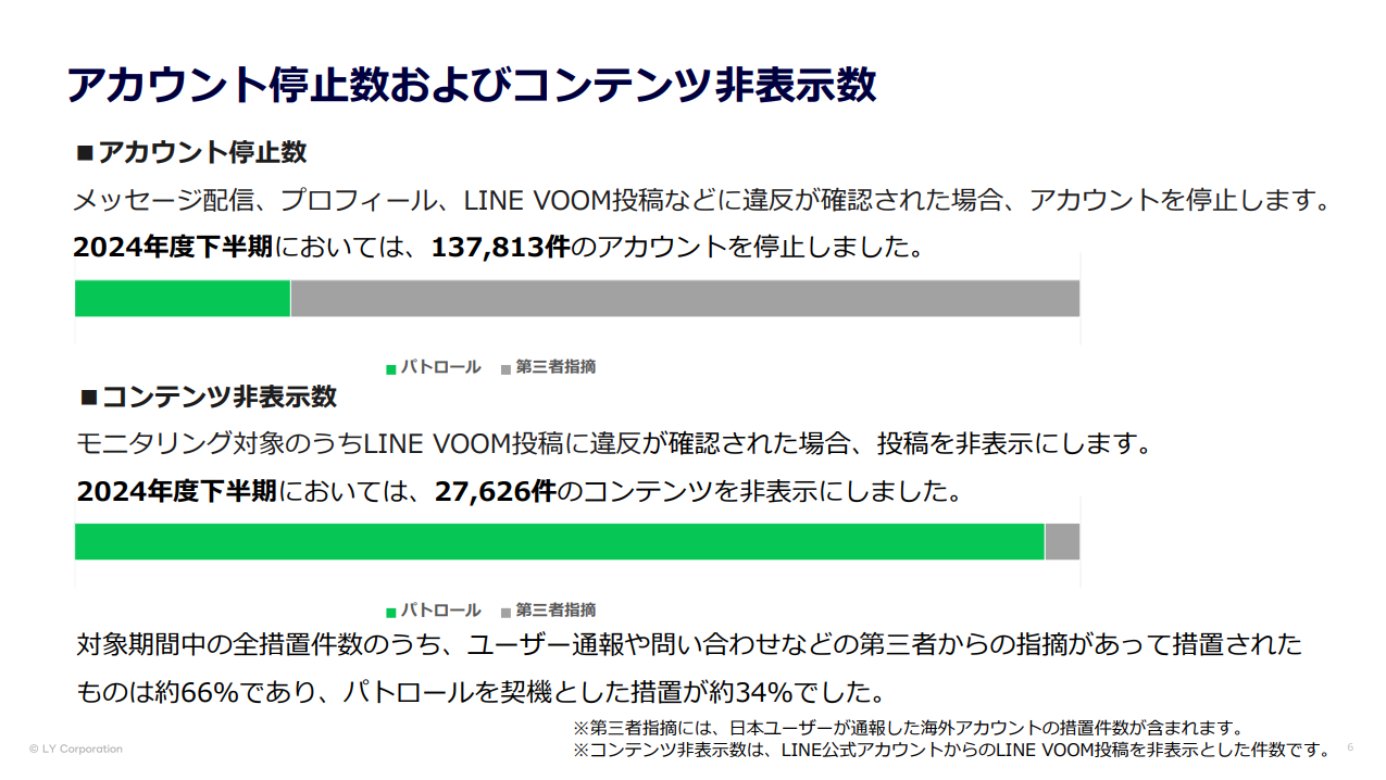 本レポートでは、モニタリングの状況について、アカウント停止数やコンテンツ非表示数、および措置理由の内訳を公開しています。