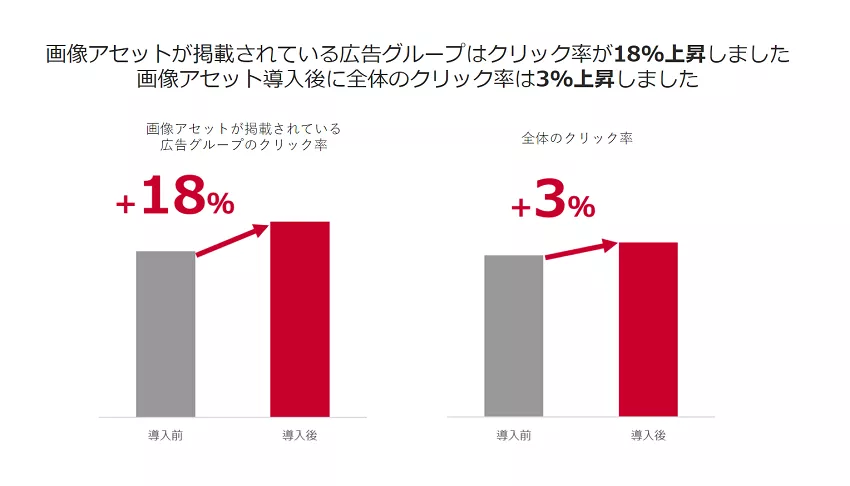 - 集計定義: 対象期間にぞれぞれインプレッションが1,000以上/クリックが1以上あり、広告グループの画像アセットインプレッションが一定数以上ある広告グループで比較し広告グループ毎の変動率の中央値を集計